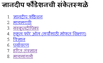 वेबसाईटवर अशी नावे लिहिण्यासाठी बुलेटेड लिस्ट वापरतात. क्रमांक यादी दाखविण्यासाठी ol (orderly list) तर बुलेटसाठी ul (unorderly list) हे टॅग वापरतात. अर्थात टॅग संपला हे दर्शविण्यासाठी /ol किंवा /ul हे टॅग लिहावे लागतात. नावाची प्रत्येक ओळ वेगळी दाखविण्यासाठी li व /li या टॅगचा वापर करावा लागतो. ज्ञानदीप फौंडेशनची संकेतस्थळे दाखविण्यासाठी खालील प्रोग्रॅम लिहून दाखविला आहे. (मराठी कसे लिहायचे याची माहिती नंतर देणार आहे. सध्या आपण त्याऎवजी इंग्रजी शब्द लिहून बघावेत.)