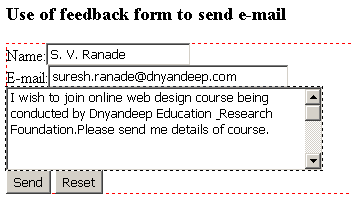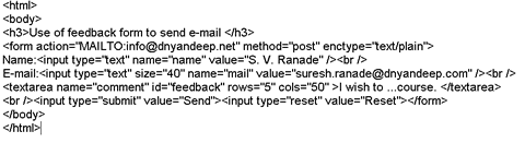 प्रोग्रॅममध्ये value मध्ये लिहिलेली माहिती केवळ माहिती भरल्यावर आउटपुट कसे दिसेल हे दाखविण्यासाठी लिहिली आहे. प्रत्यक्षात ती माहिती आउटपुट च्या मोकळ्या रकान्यांत भरावी लागते. submit बटन दाबले की युजरच्या कॉम्प्युटरवरील outlook express द्वारे मेल पाठविली जाते.