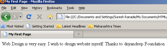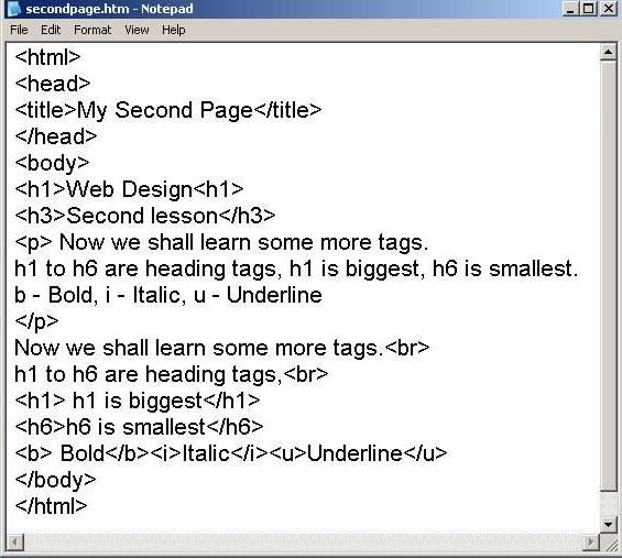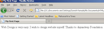 येथे सर्व शब्द एकाच ओळीत आलेले दिसतात. याचे कारण की ओळ बदलण्यासाठी लागणारा BR टॅग आपण दिला नव्हता. secondpage.htm आता नोटपॅडमध्ये खाली दाखविल्याप्रमाणे टाईप करा.